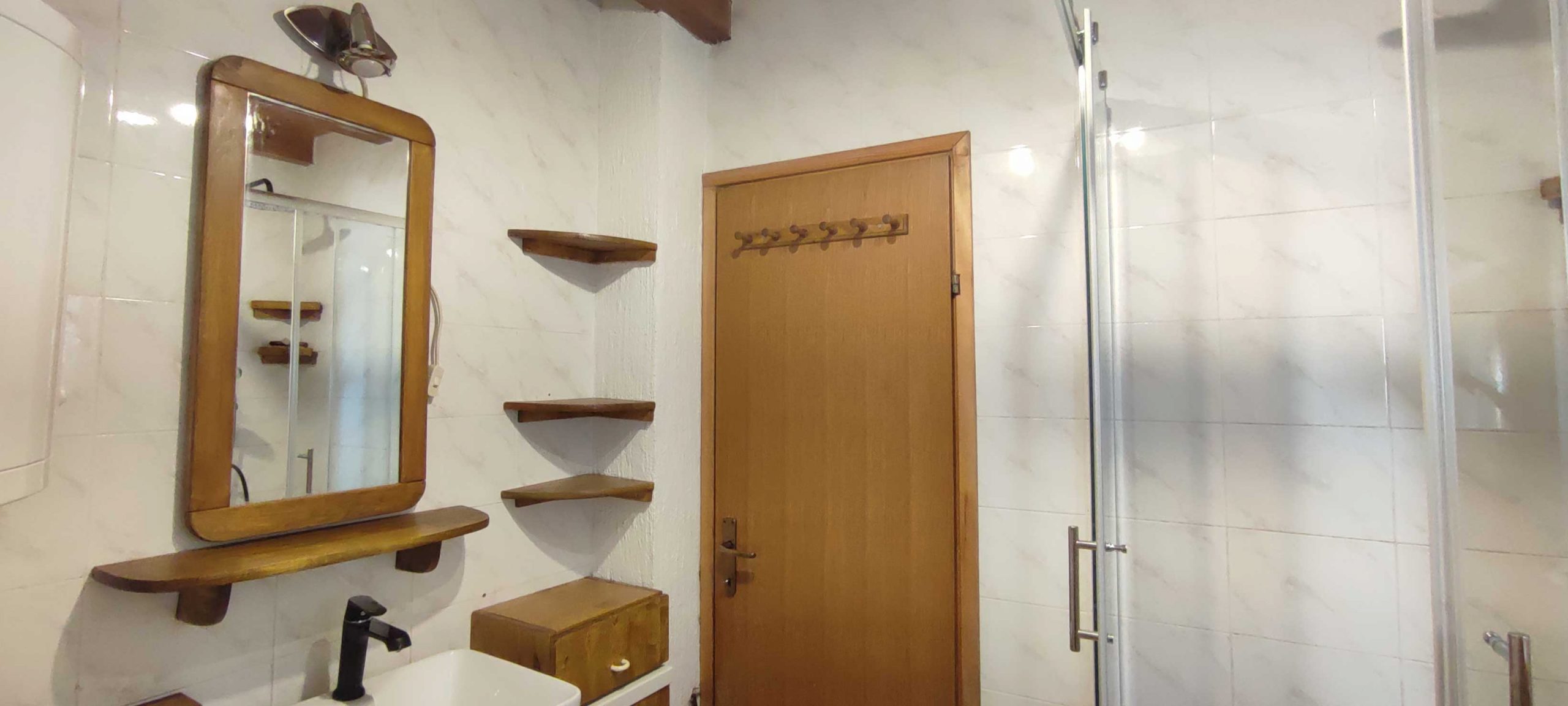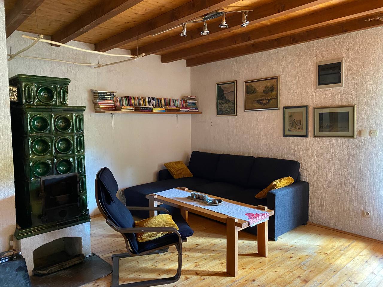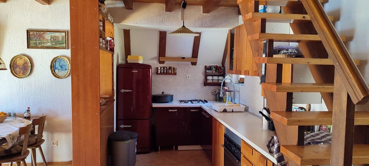 U prizemlju se nalazi veliki dnevni boravak s blagovaonom, kuhinjom i kupaonicom a sve to grije tijekom zime velika kaljeva peć čija toplina ugrije i gornji kat do kojeg vode drvene stepenice.
